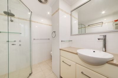 * Quality modern bathroom with neutral tiles, glass shower screen, stone and timber vanity