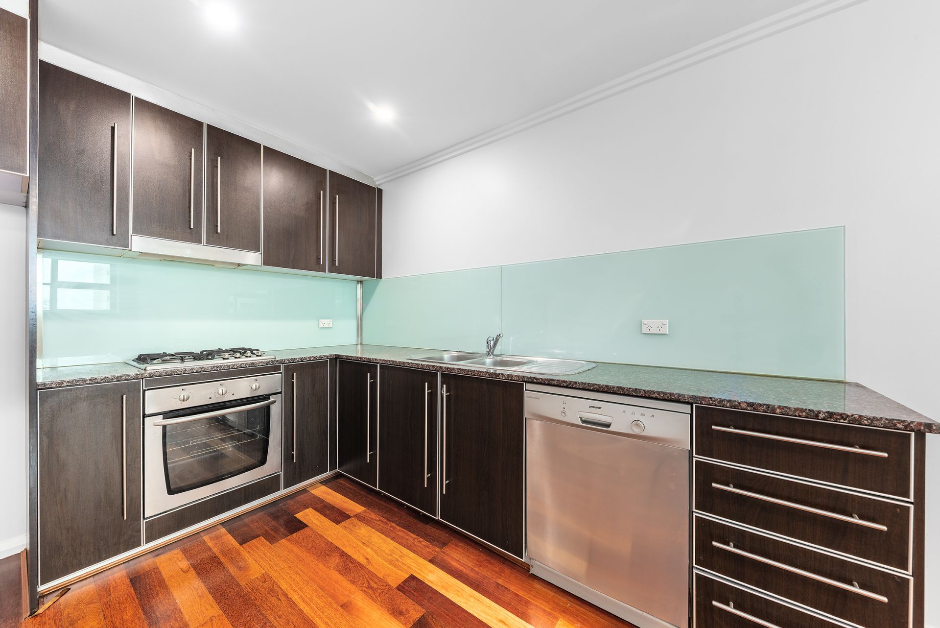 * A contemporary kitchen featuring stone countertops and stainless steel appliances, including dishwasher and gas cooktop